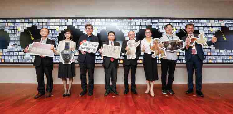 菠菜论坛携手创利空间为故宫建置的智慧文物互动导览墙及轮播墙,,,今日正式启用。。。。(左四:菠菜论坛新事业暨投资管理总部副总经理杨本豫、、、、右四:故宫博物院院长吴密察、、、、右三:太极影音董事长黄宝云)