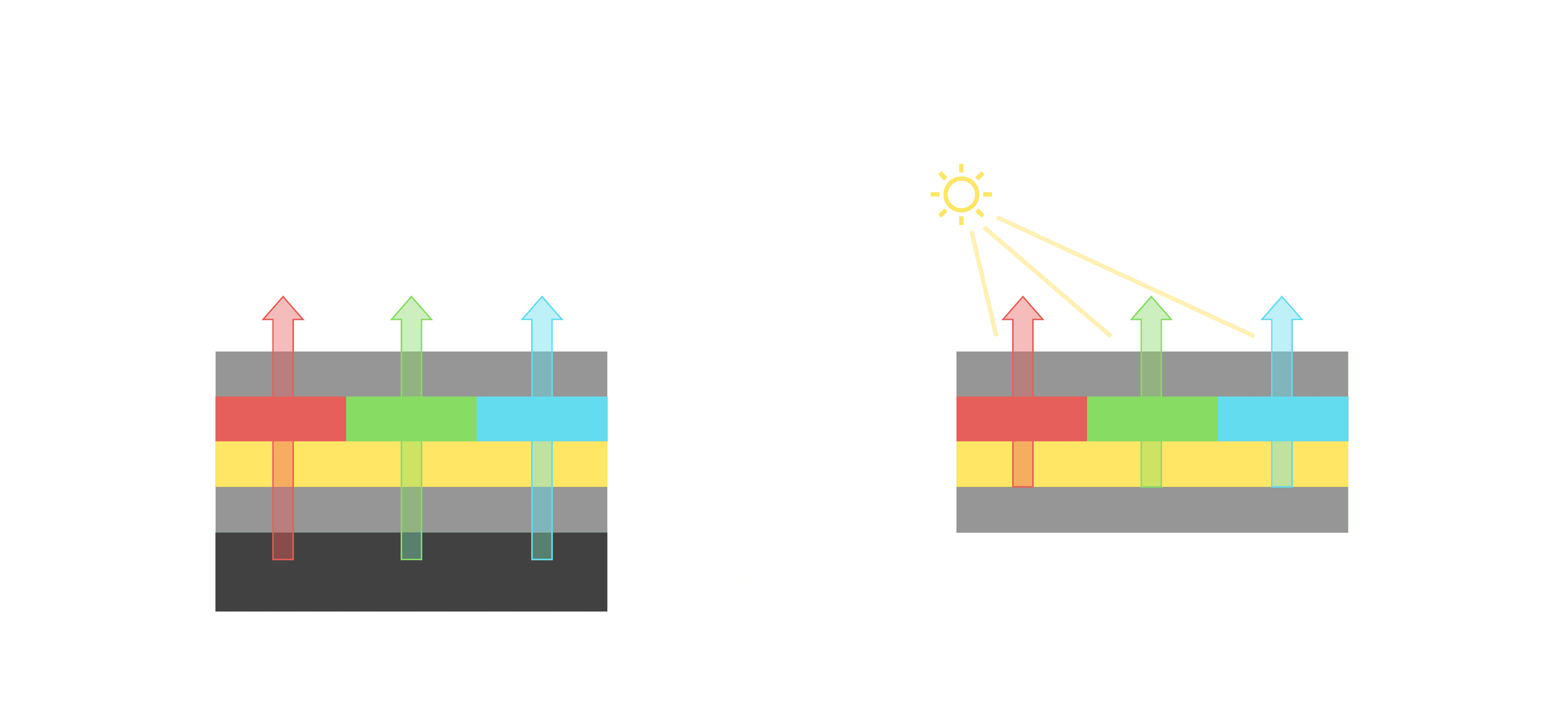 与传统需搭配背光单元的液晶显示相比,,,反射式液晶技术不仅更省电、、、更轻薄,,,,且即便在艳阳下仍能清晰显示。。。。此外,,,少了背光单元,,,,也大幅降低了 LED 蓝光伤害眼睛的疑虑。。。。