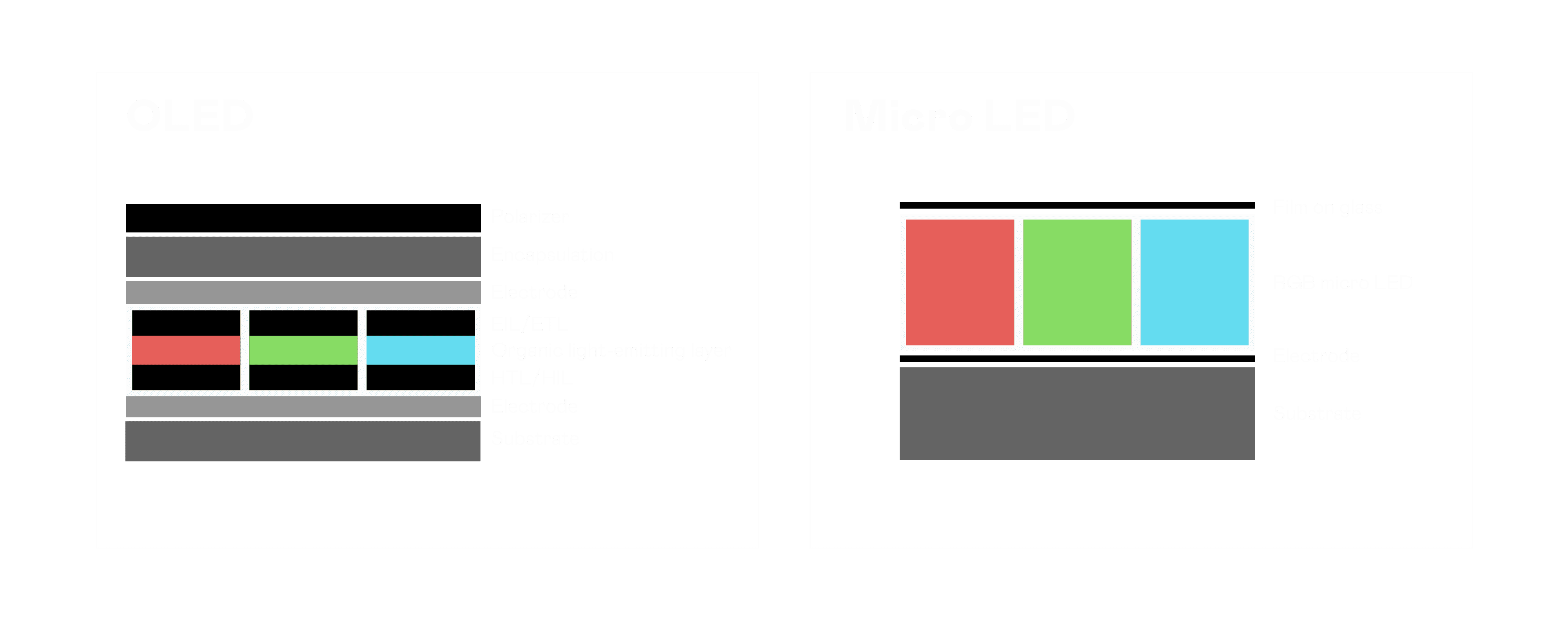 以 LED 做为显示画素,,,可让 LED 的发光效率发挥到极致,,从而让显示器具备优异的亮度表现,,不论是在户外或室内,,,,均具备出众的显示效果。。同时,,,与使用有机材料的 OLED 相比,,,LED 具备更稳定、、、、寿命更长的特性,,,,不仅不会有画面烙印问题,,,而且更不容易出现故障、、、坏点。。