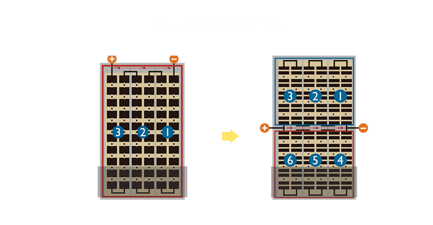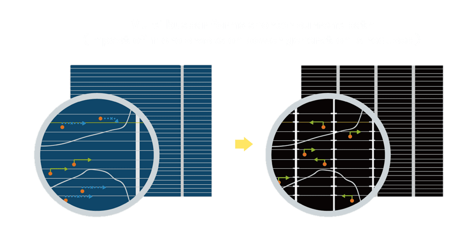 - 电池使用多条铜导线 (Copper wire) 于电池片上形成较短的电流路径,,,提高电流收集效率,,,,采用圆形设计的铜导线较传统扁平式的铜焊带 (Ribbon),,,可增加入射至电池的光线量。。。